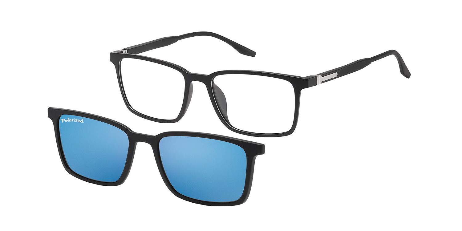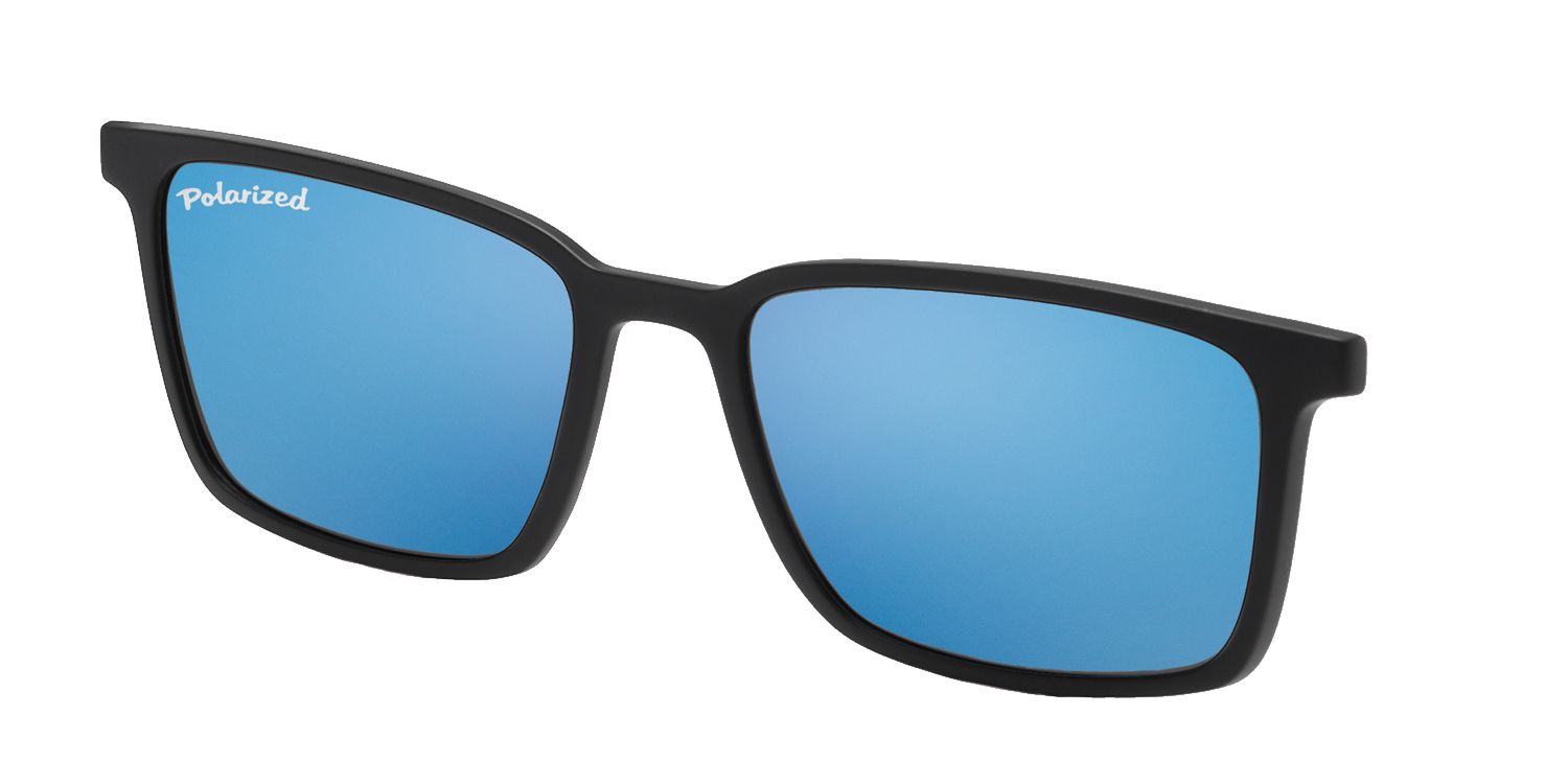 Clip-on with magnetic mounting and polarized revo blue sun lenses, suitable for frame TRC-185, including hard case. Frame and clip-on can be ordered separately.