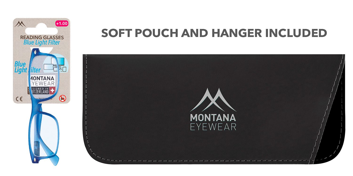 Reading glasses with hanger - Aspheric and scratch free lenses with Blue light filter - Soft pouch included
