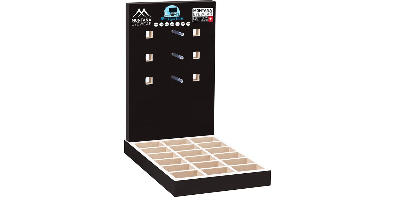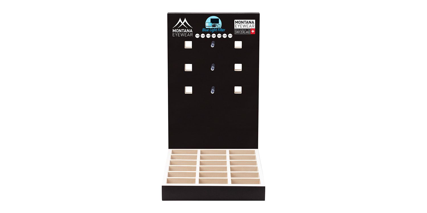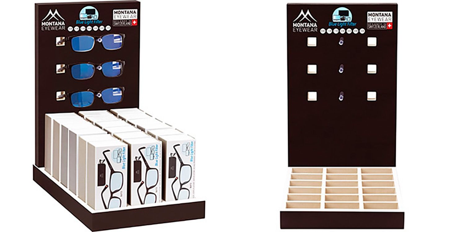 Montana display with 3 presentation positions and 18 storage positions for Montana BLF reading glasses in box packaging.