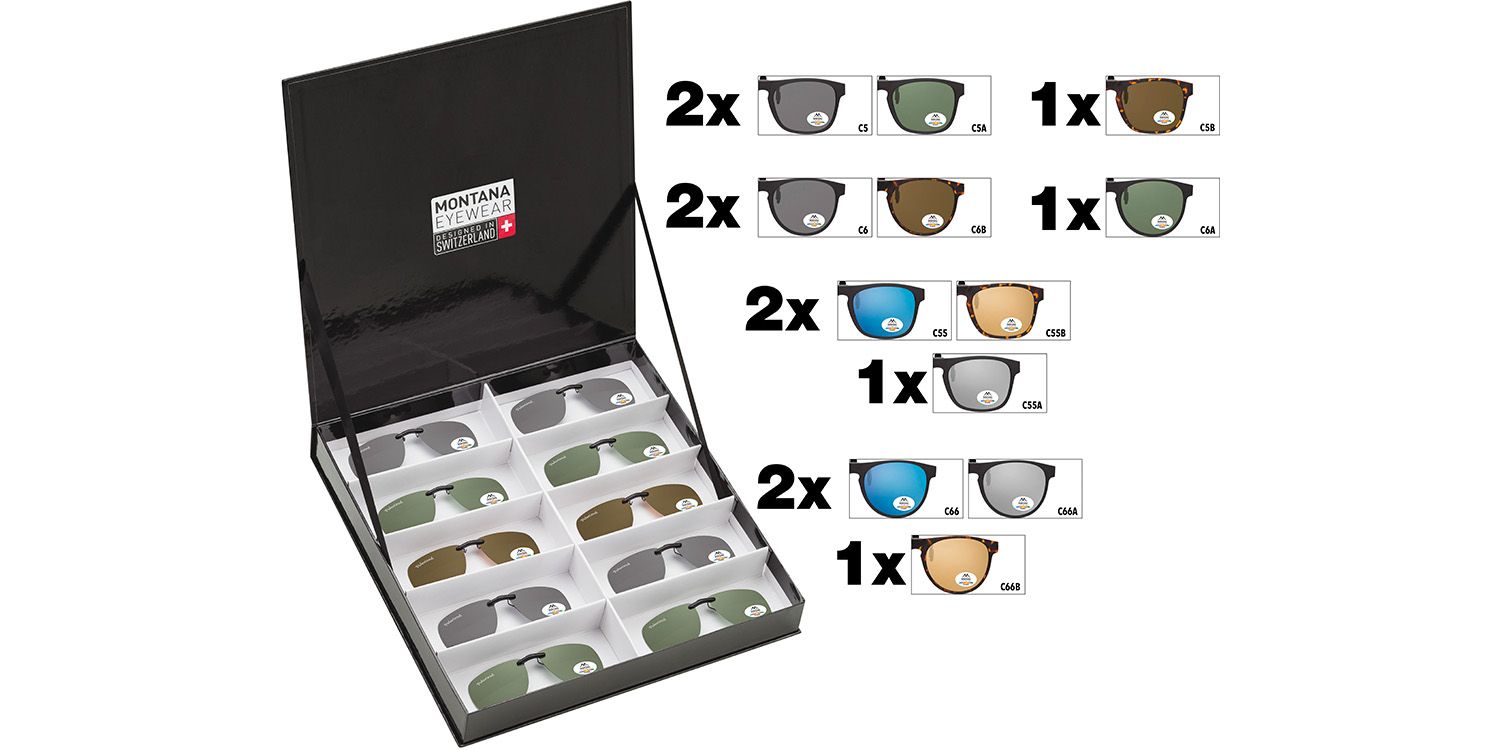 Clip-ons for Acetate frames x10: 2xC5; 2xC5A; 1xC5B; 2xC6; 1xC6A; 2xC6B