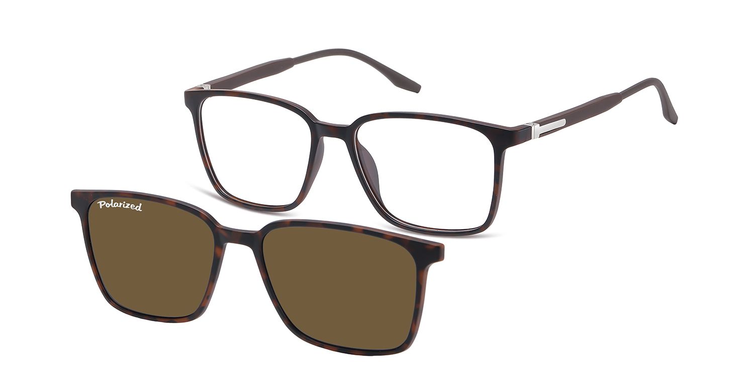 Optical frame with in matt turtle finishing, suitable for magnetic clip-on in identical colour, with polarized sun lenses.